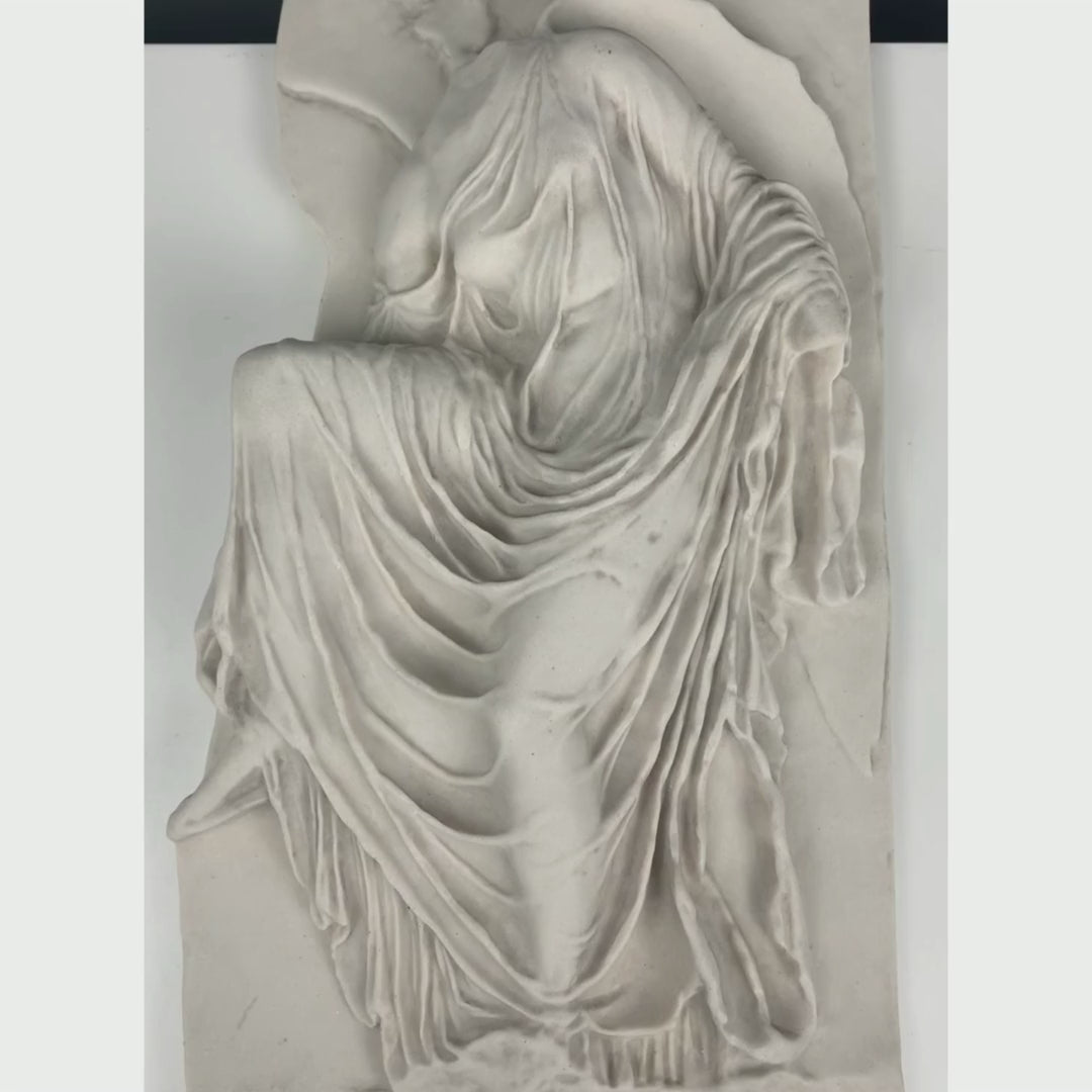 Bas-relief Niké ajustant sa sandale - sculpture en marbre