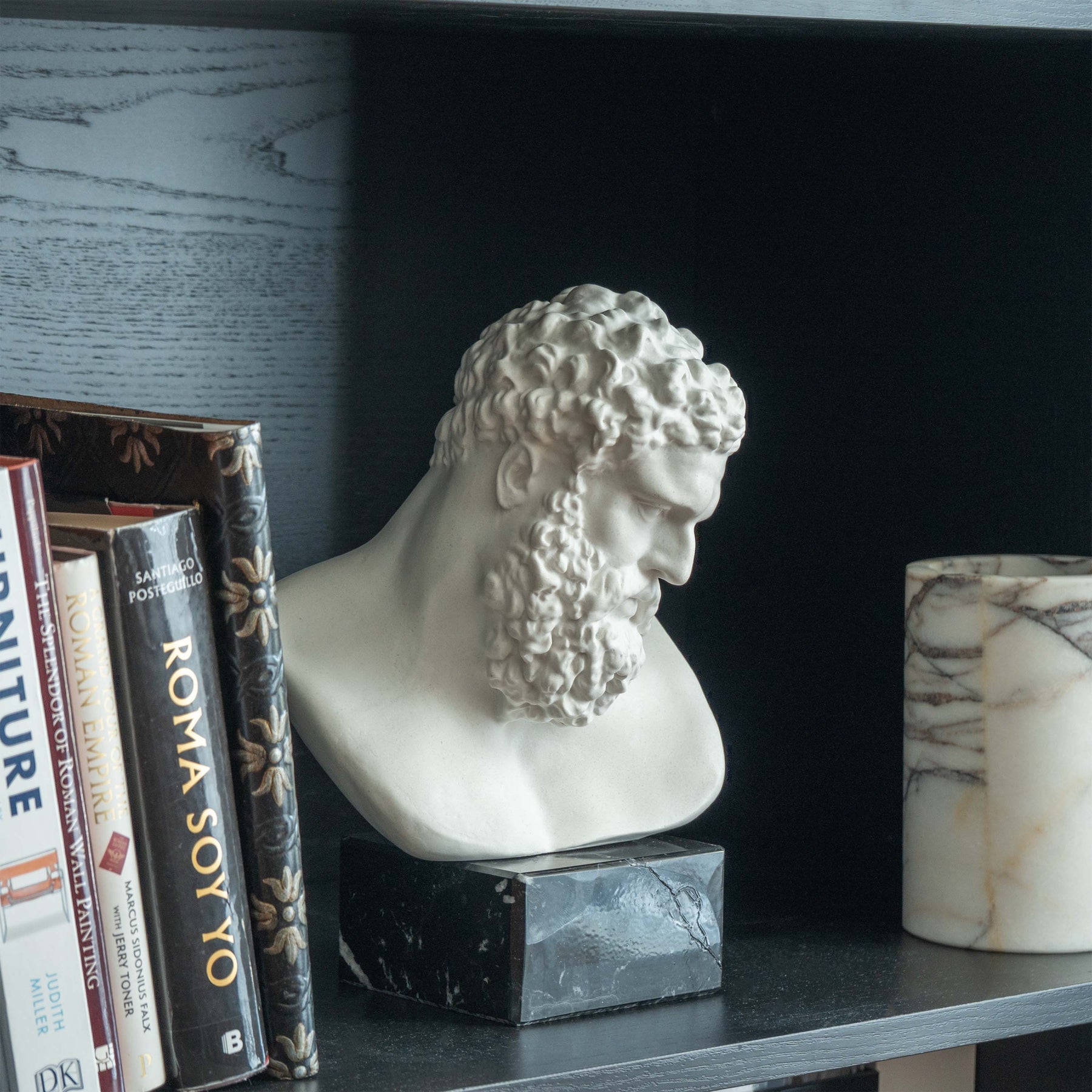 Monté sur un socle en marbre noir poli, le buste gagne en contraste et en présence ancrée. La pierre sombre et profonde soutient la forme lumineuse, transformant la lumière et l’ombre en sculpture : chaque boucle, chaque plan du visage se révèle avec une précision digne d’un musée. Le marbre ajoute gravité, stabilité et une finition intemporelle qui élève l’œuvre du simple décor à l’héritage.