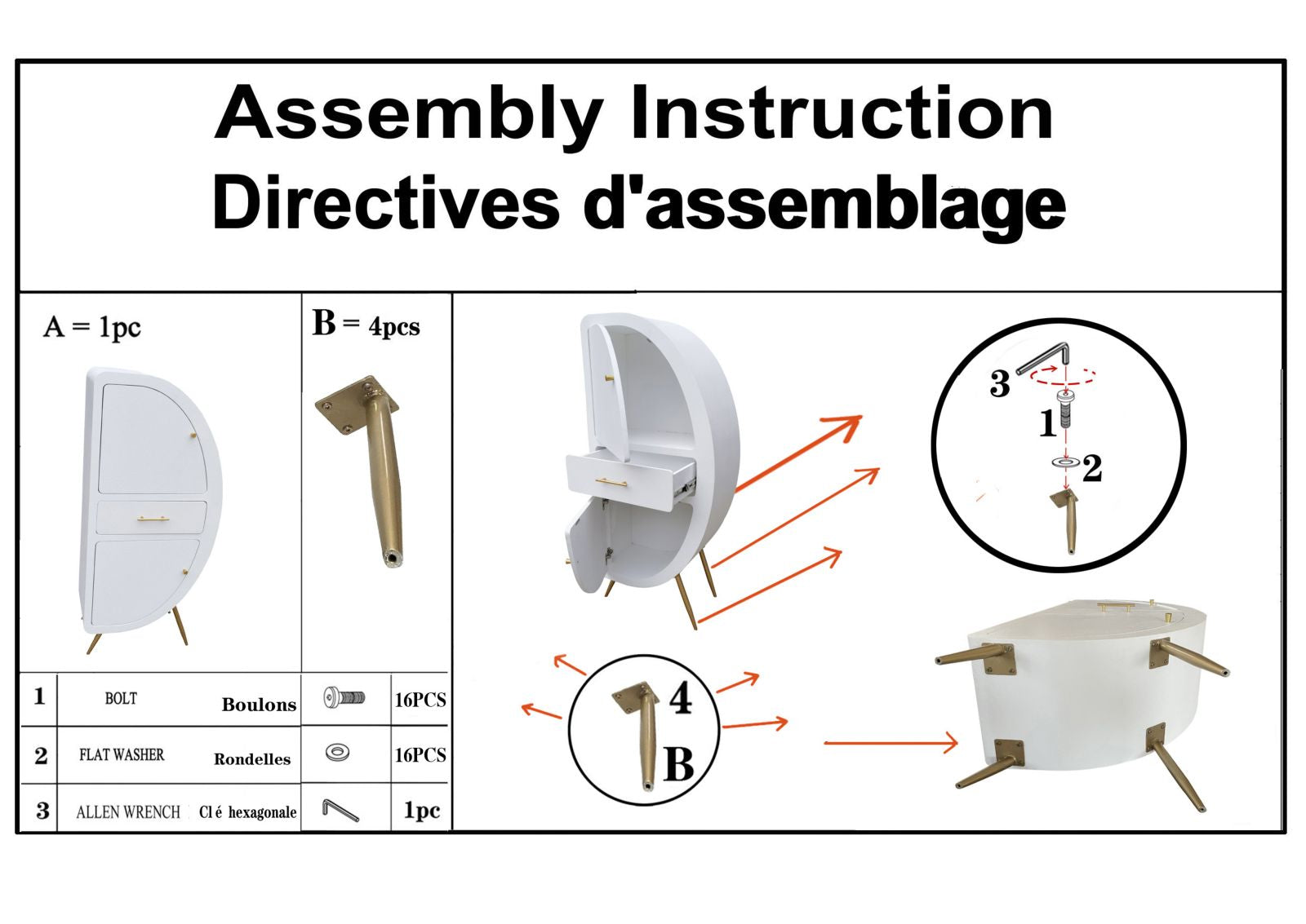 Meuble en bois blanc aux lignes arrondies qui rappellent les antiquités modernes des années 70. Complet avec 2 portes et un tiroir. Pieds en métal doré à assembler.Bougeoir en métal doré aux élégantes décorations florales.