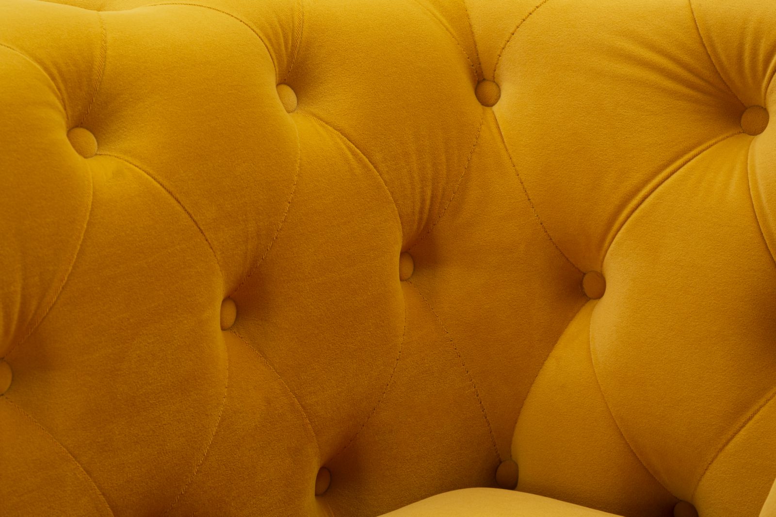 Fauteuil ocre avec pieds dorés à assembler, recouvert de velours matelassé. Idéal pour les environnements modernes et raffinés, il ajoute une touche de luxe et de confort.Bougeoir en métal doré aux élégantes décorations florales.