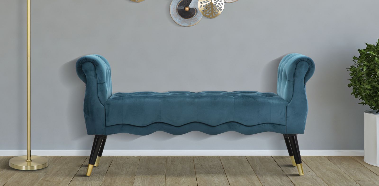 Banc en bois et velours bleu sarcelle. Sièges majestueux avec une finition dorée inspirée des loges des grandes divas hollywoodiennes. Idéal à placer dans la chambre ou le salon pour se sentir comme une star.Bougeoir en métal doré aux élégantes décorations florales.