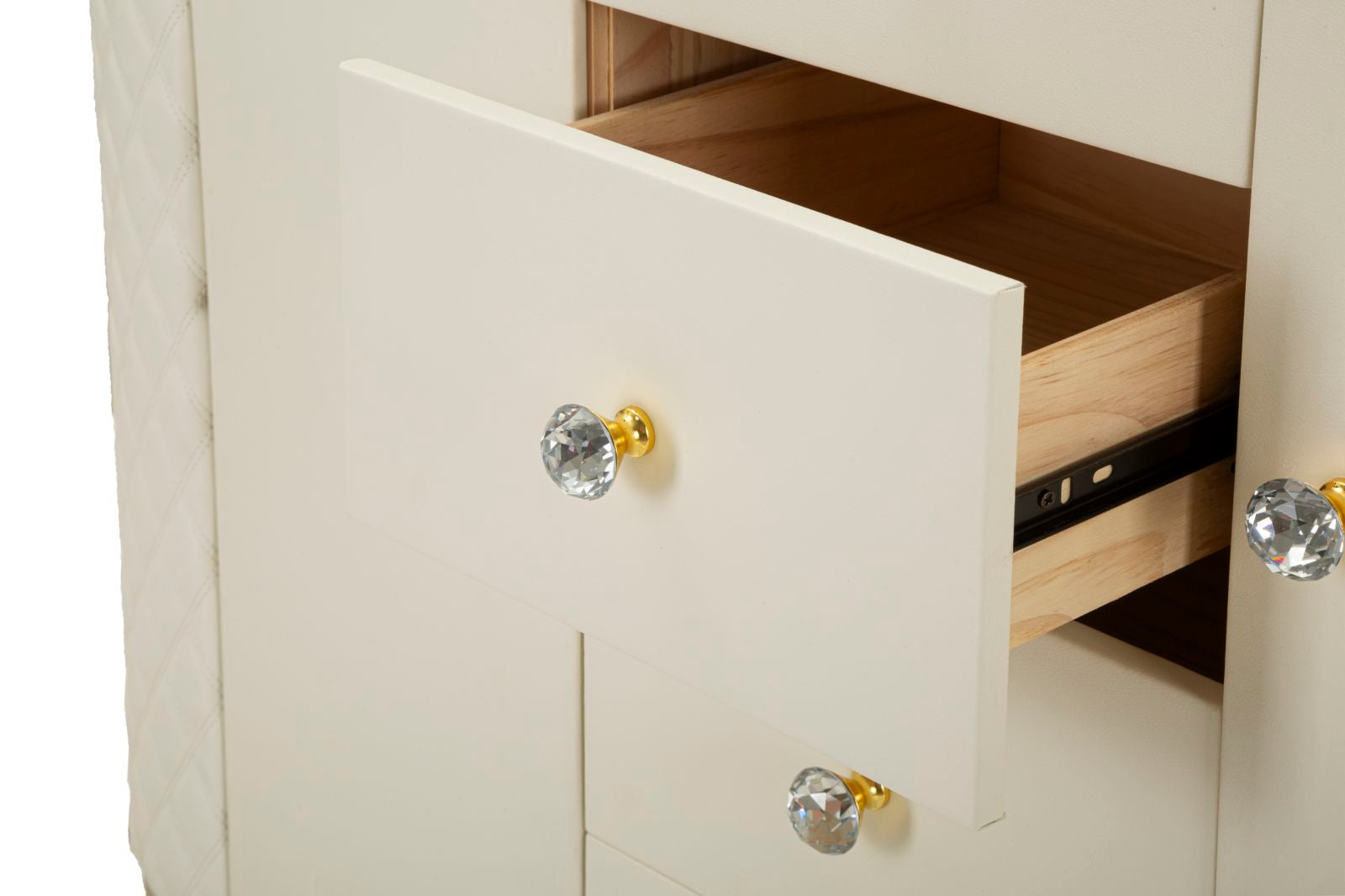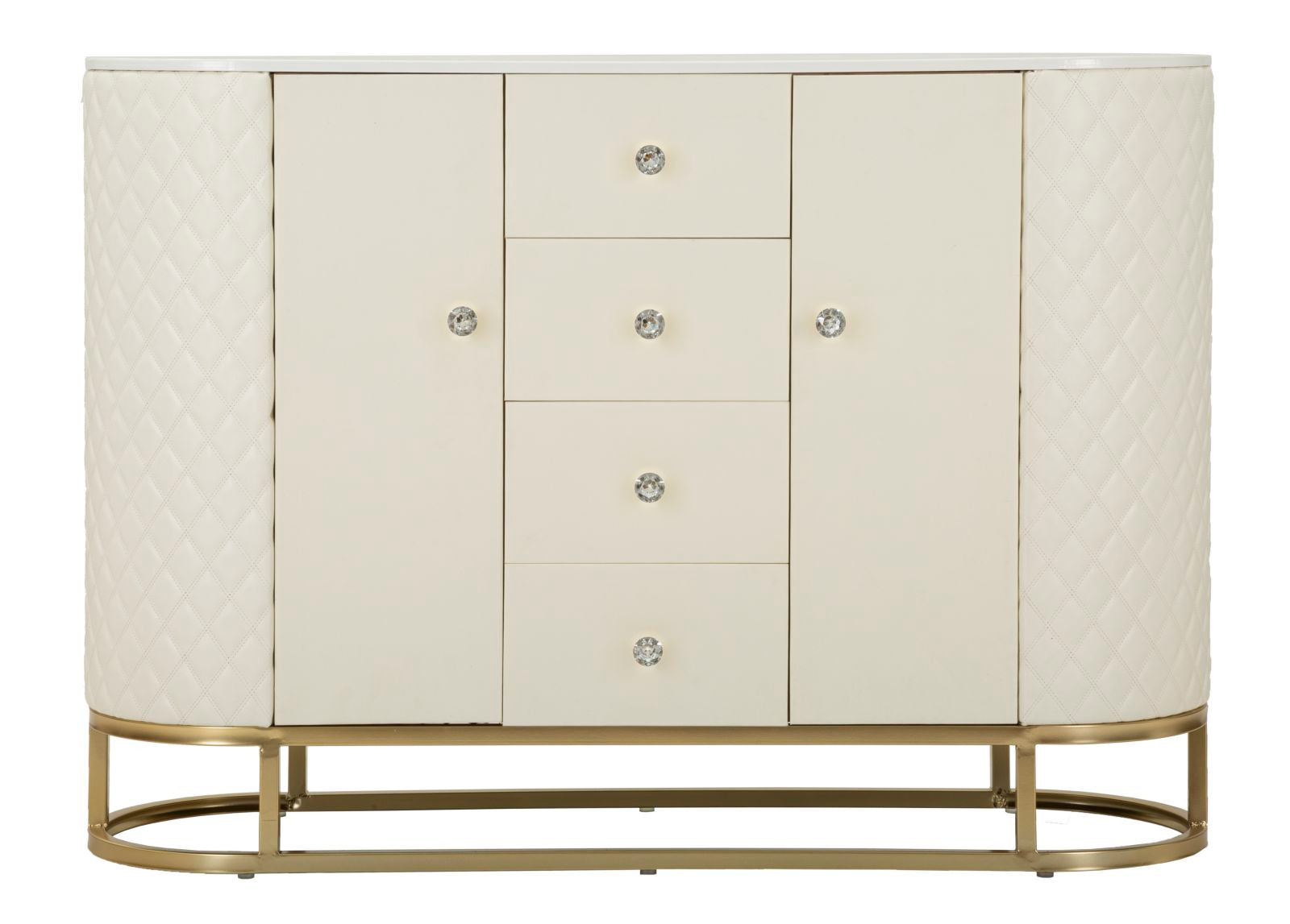 Meuble élégant et fonctionnel avec tiroirs et portes, recouvert de simili cuir matelassé, les pieds circulaires dorés ajoutent une touche de luxe et de modernité au meuble.Bougeoir en métal doré aux élégantes décorations florales.