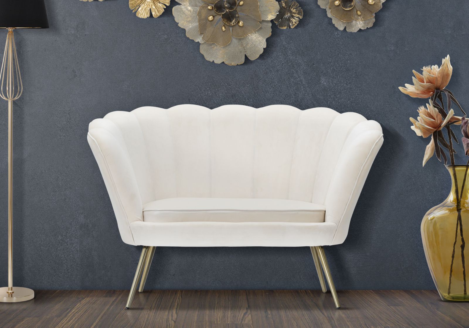Canapé 2 places en velours couleur crème avec pieds dorés au design particulier qui rappelle les pétales d'une fleur. L'élégance du velours et du métal doré s'allient pour créer un style unique.Bougeoir en métal doré aux élégantes décorations florales.