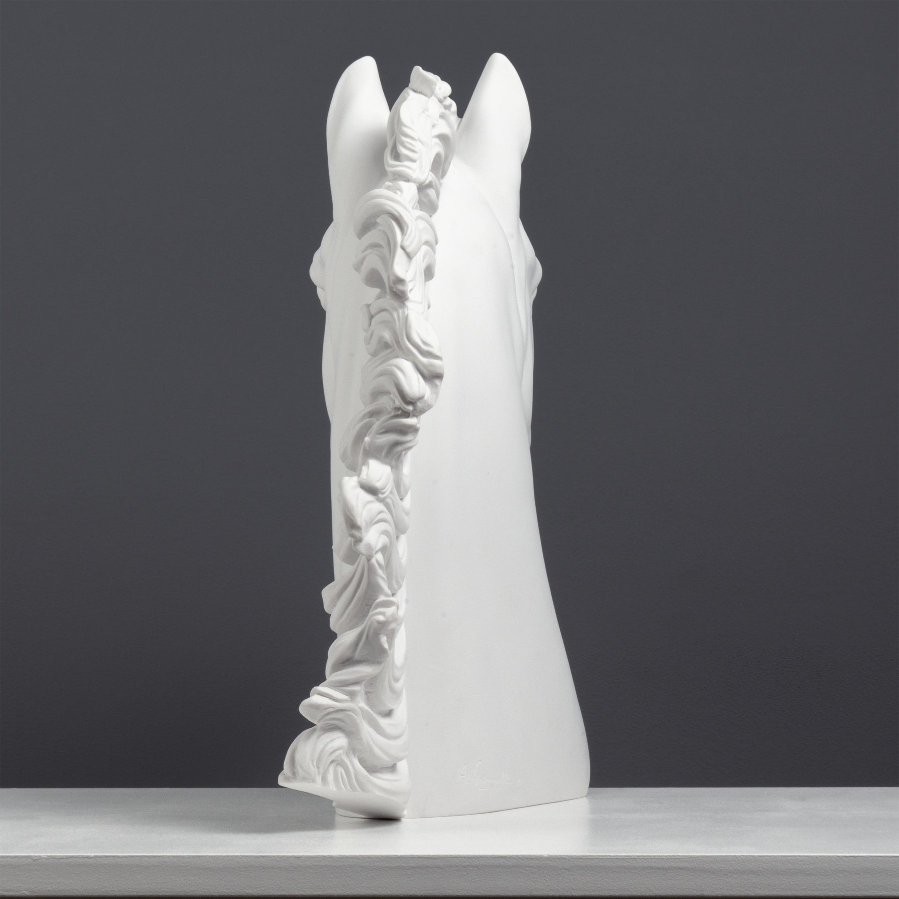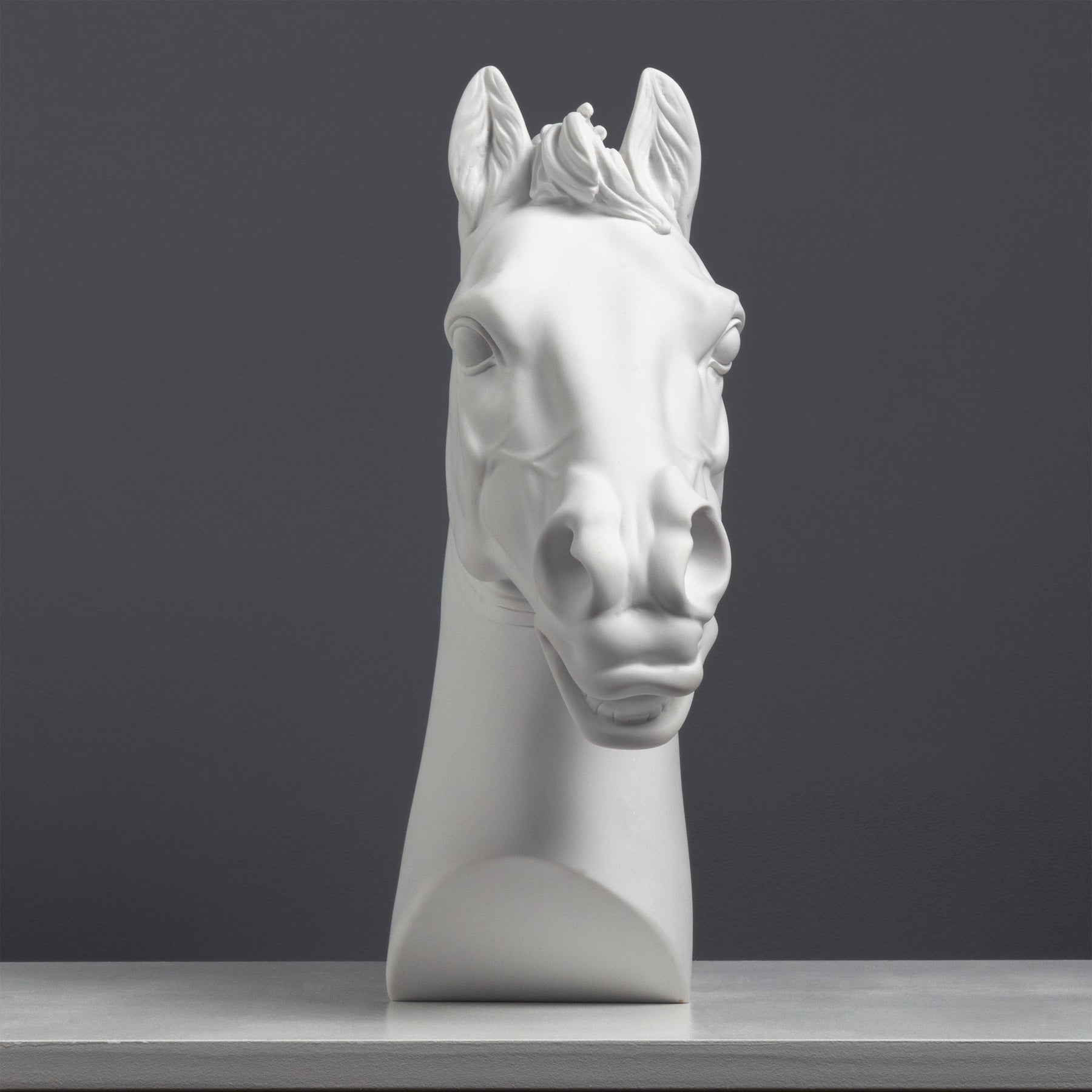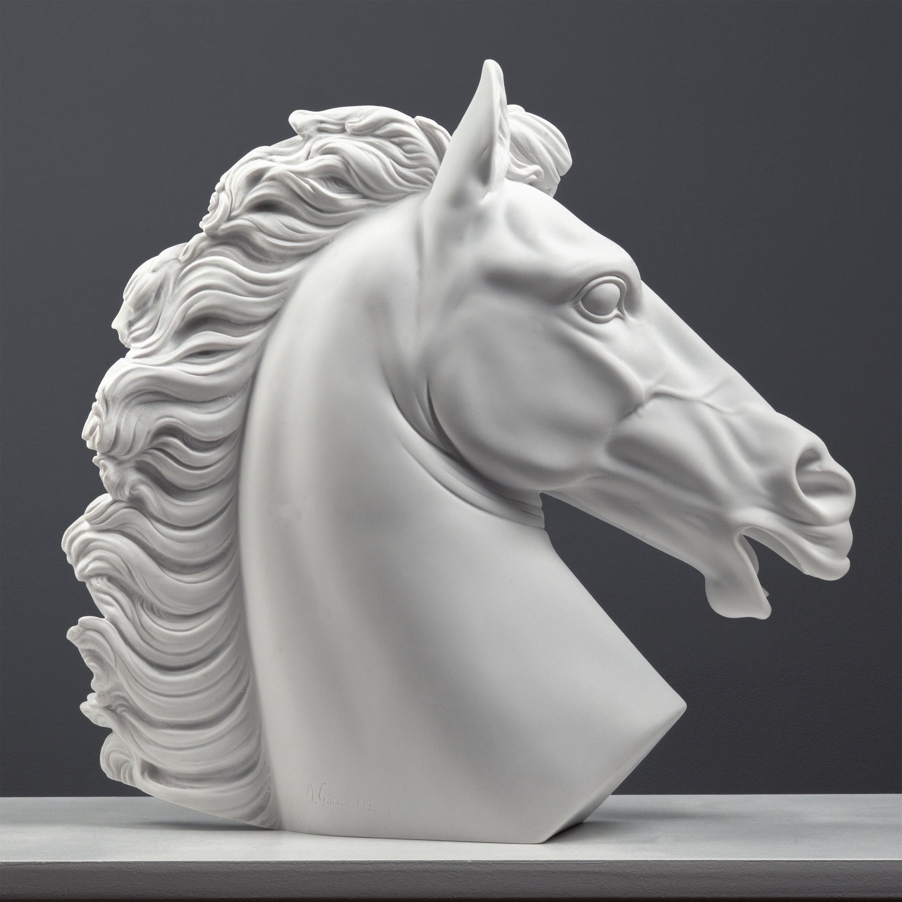 Cette tête de cheval imposante traduit cet héritage par son encolure arquée, son regard attentif et ses traits finement sculptés — une composition qui suggère le mouvement même dans l’immobilité. L’équilibre entre tension et élégance confère à l’œuvre une autorité silencieuse, comme suspendue entre départ et retour.
