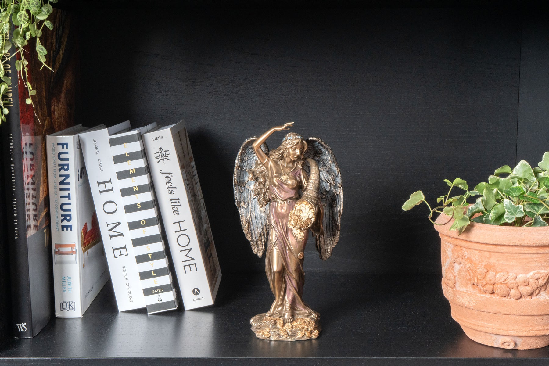 Fortuna, déesse de la chance et de la prospérité, descend avec des ailes gracieuses et une corne d’abondance débordant d’or. Ses draperies fluides et son regard serein évoquent l’espoir, l’opulence et la promesse d’un destin favorable. Cette sculpture en bronze à froid saisit la magie du destin en mouvement — un rappel intemporel que la chance sourit aux audacieux et que les opportunités brillent là où se rencontrent beauté et conviction.