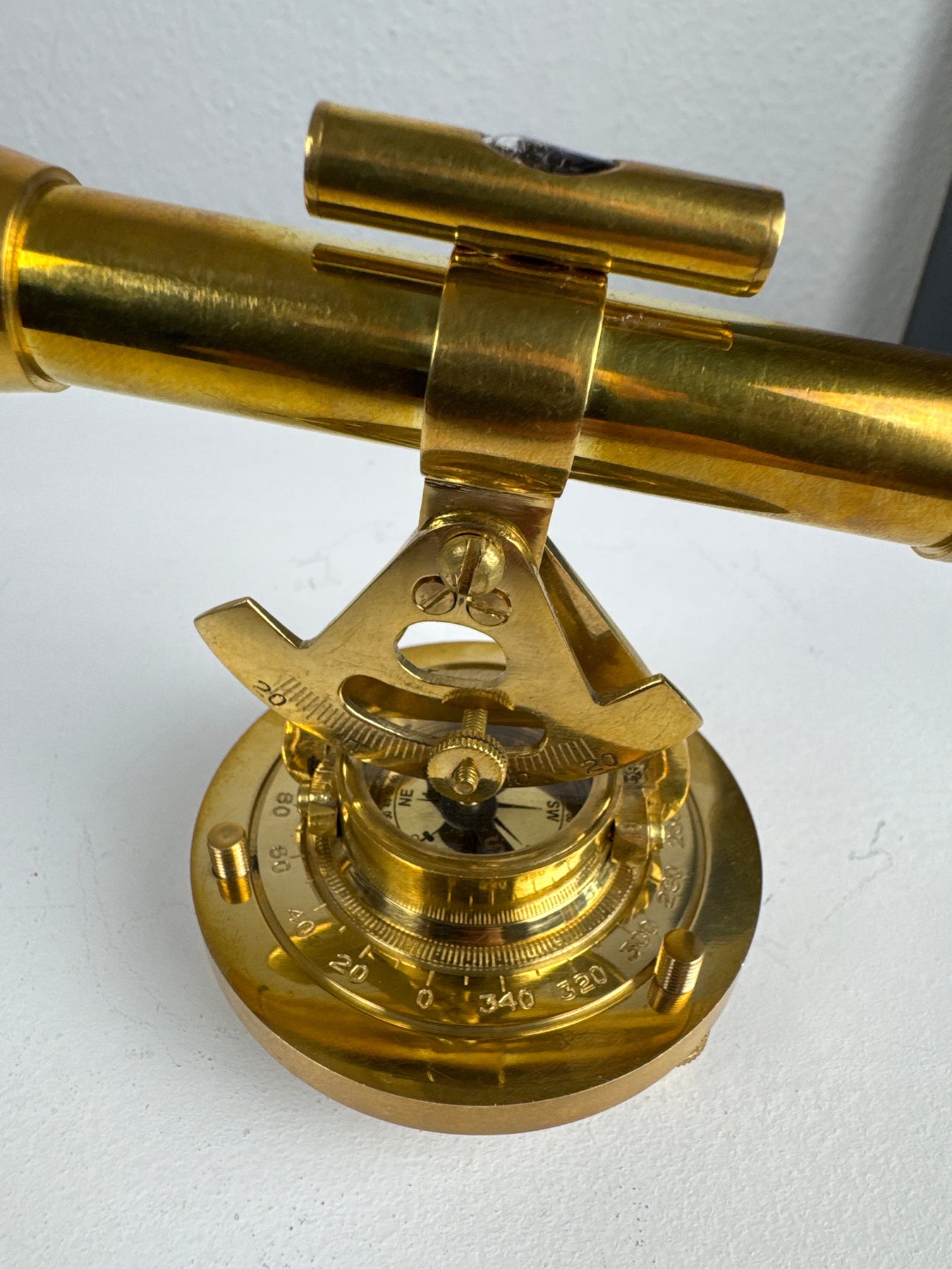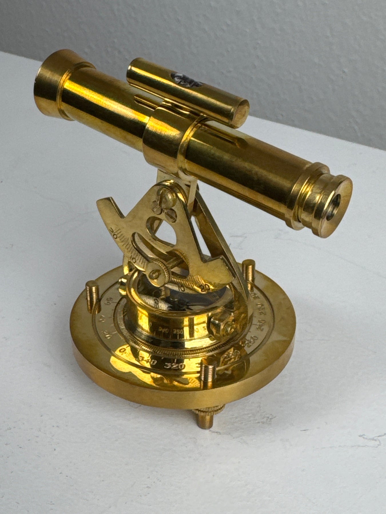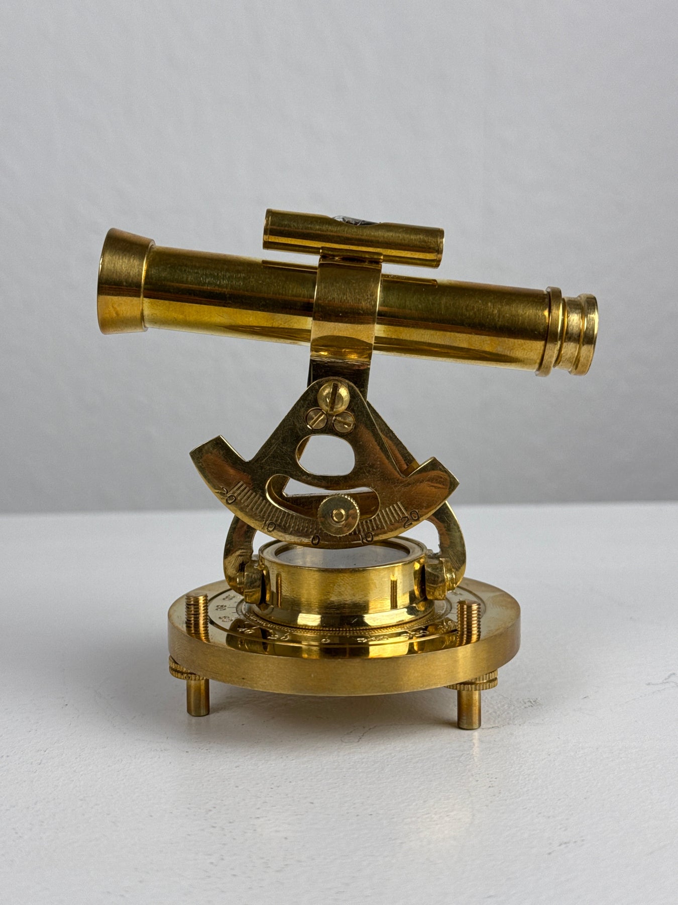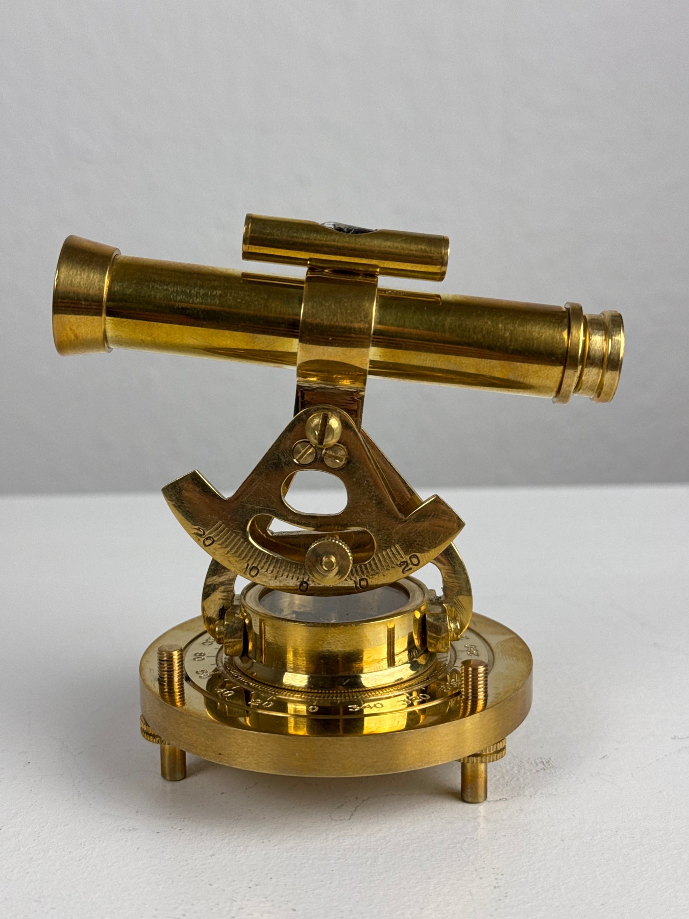 Inspiré des instruments d'arpentage vintage, ce télescope en laiton allie un aspect décoratif au charme historique. Monté au-dessus d'un cadran de boussole, le télescope pivote et s'incline sur une base métallique solide, ce qui en fait un ajout captivant à tout bureau ou étagère de collectionneur.