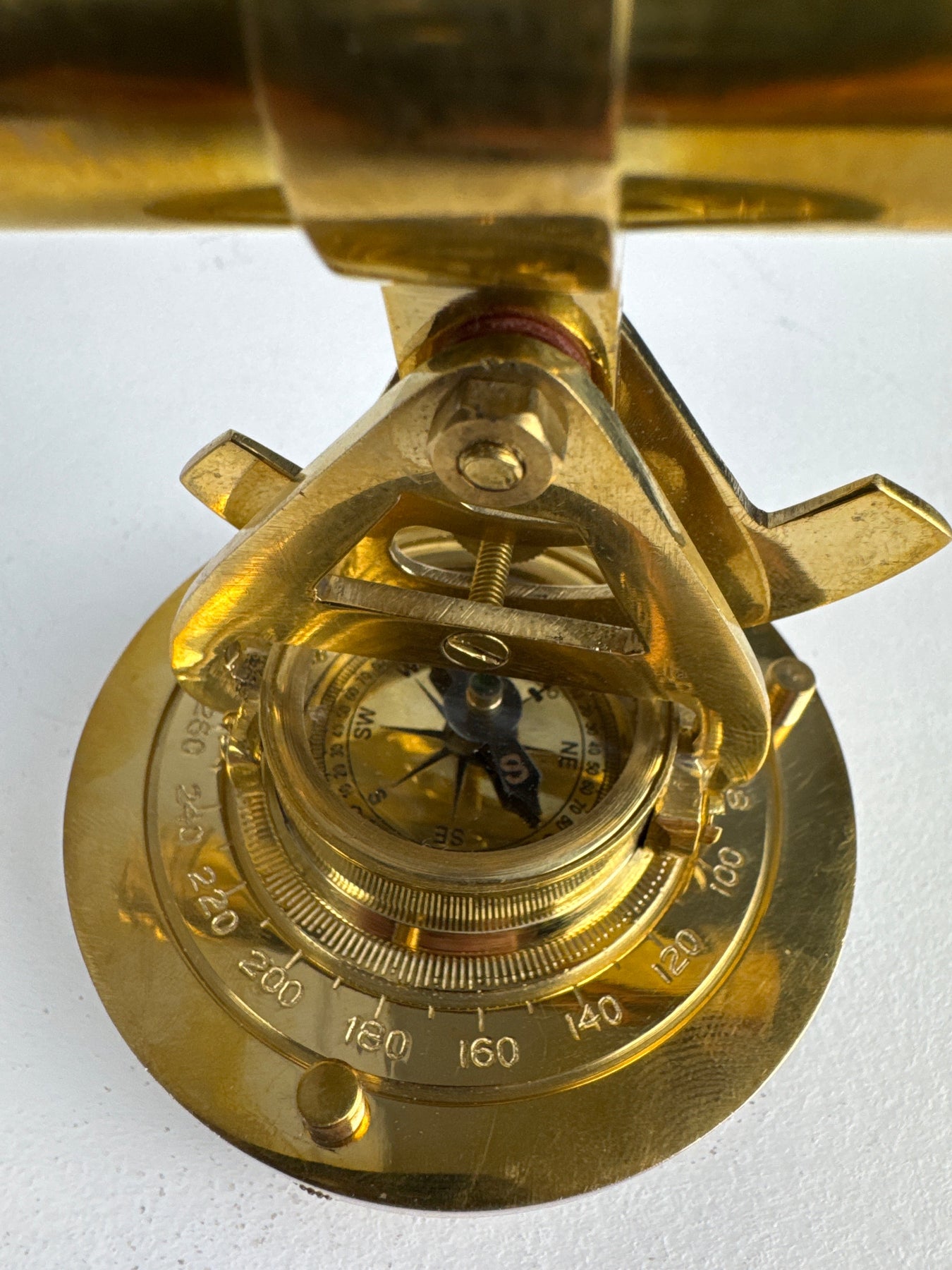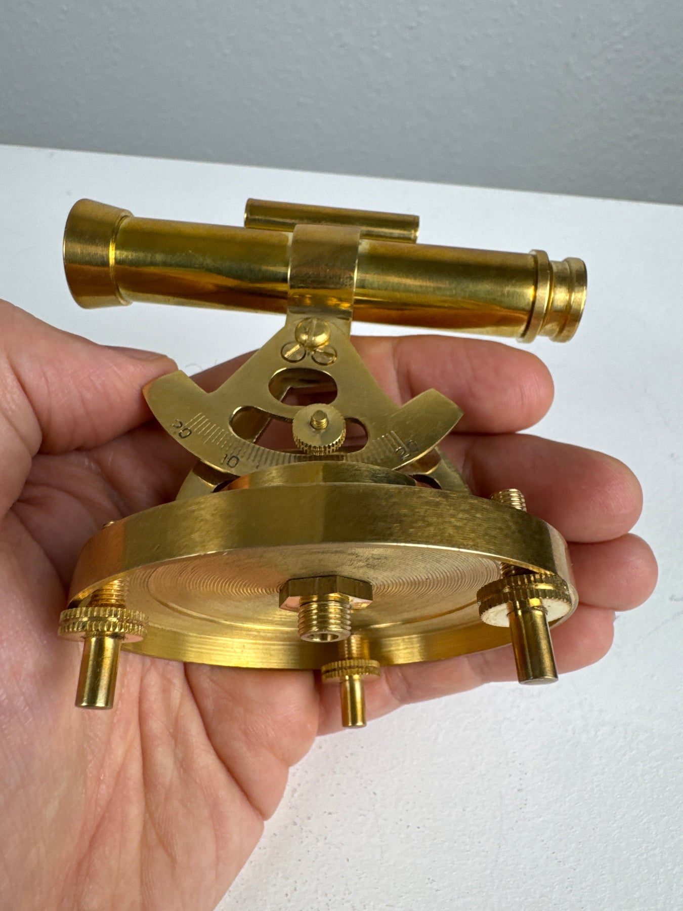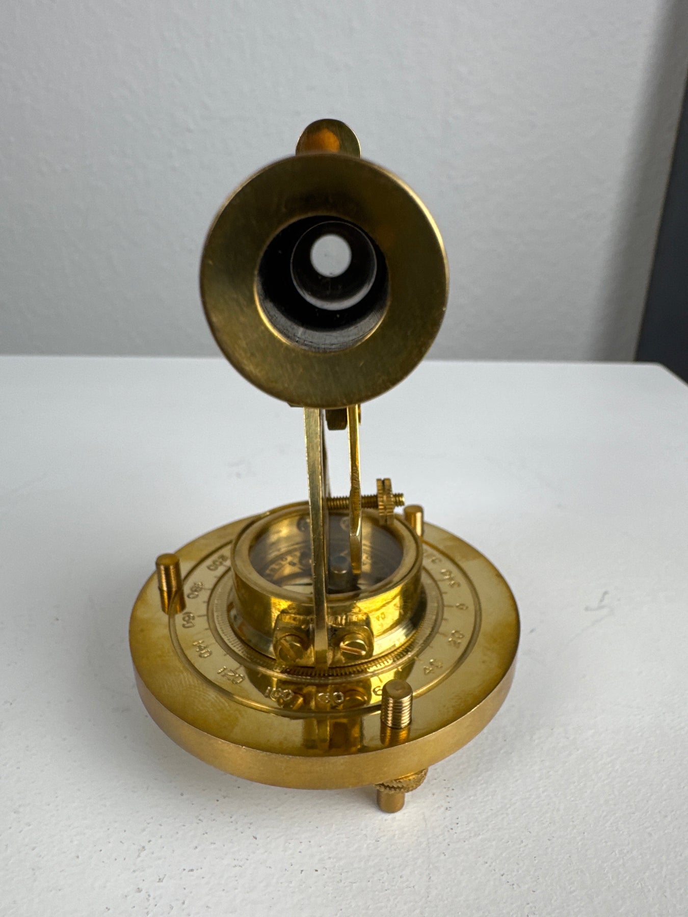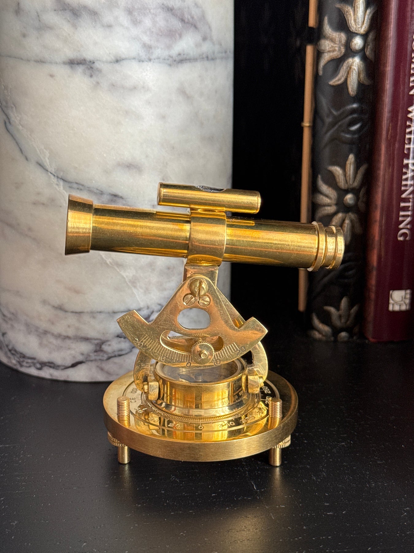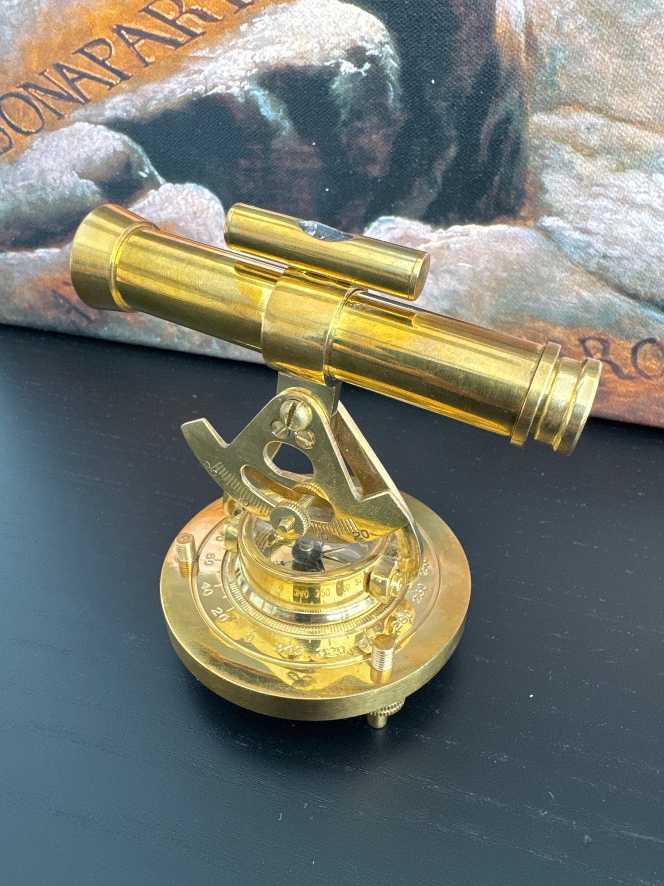 Inspiré des instruments d'arpentage vintage, ce télescope en laiton allie un aspect décoratif au charme historique. Monté au-dessus d'un cadran de boussole, le télescope pivote et s'incline sur une base métallique solide, ce qui en fait un ajout captivant à tout bureau ou étagère de collectionneur.