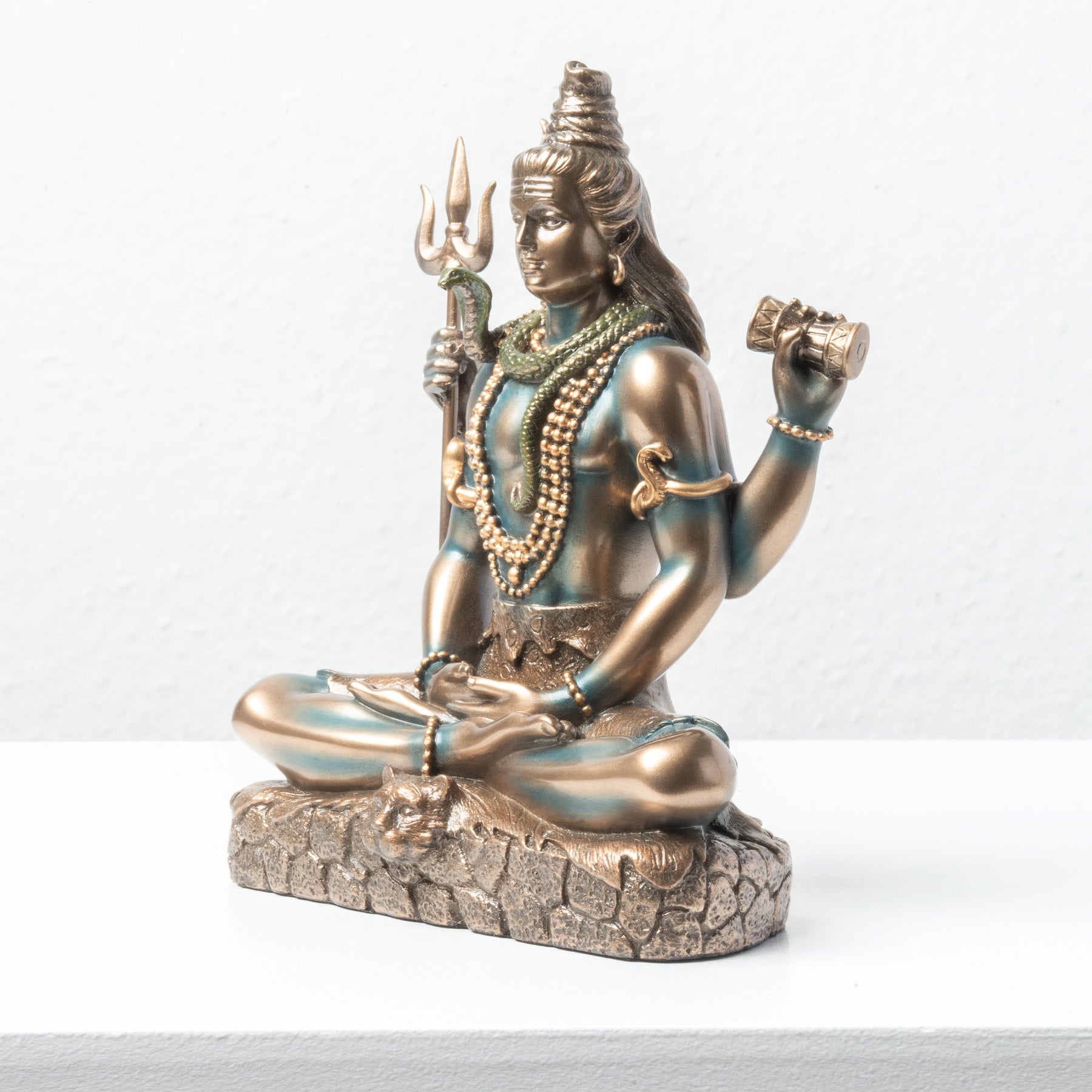 Shiva demeure dans un calme absolu, mais sa présence semble vibrer de puissance. Paré de perles sacrées, couronné du serpent de la sagesse et tenant le trident de la force cosmique, il incarne création, destruction et renouveau en une forme sereine. Cette sculpture en bronze à froid apporte protection, transformation et paix divine — un rappel que la véritable force vient de l’intérieur et que la paix est la plus grande des victoires.