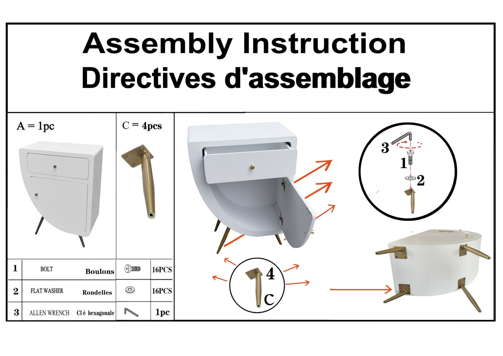 • Table de chevet en bois blanc aux lignes arrondies qui rappellent le design moderne des années 70. Comprend un tiroir et une porte. Pieds en métal doré à assembler.Bougeoir en métal doré aux élégantes décorations florales.
