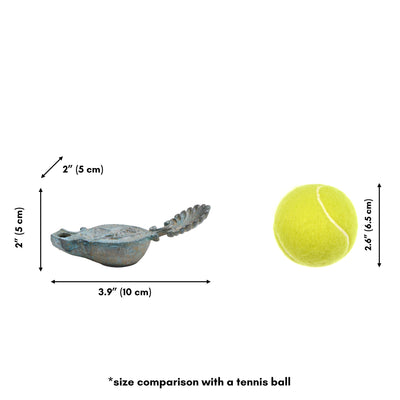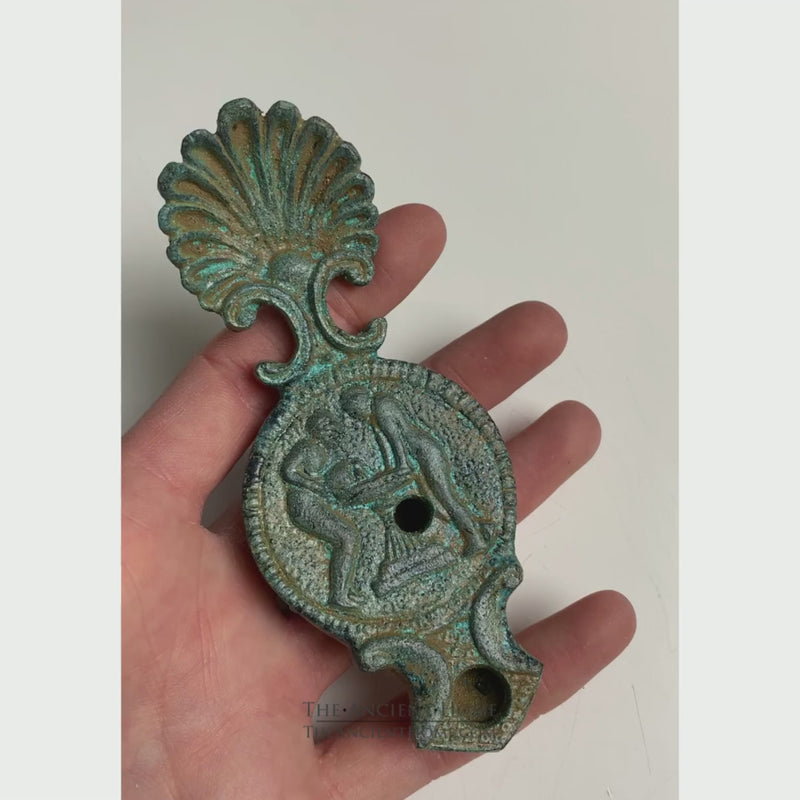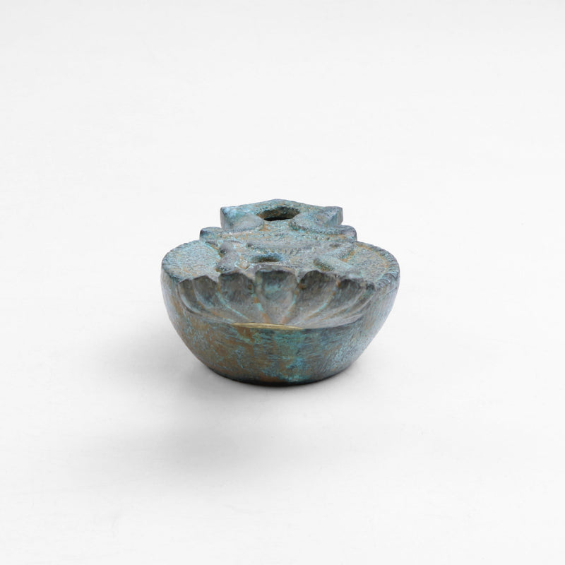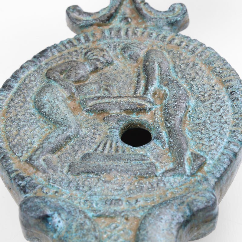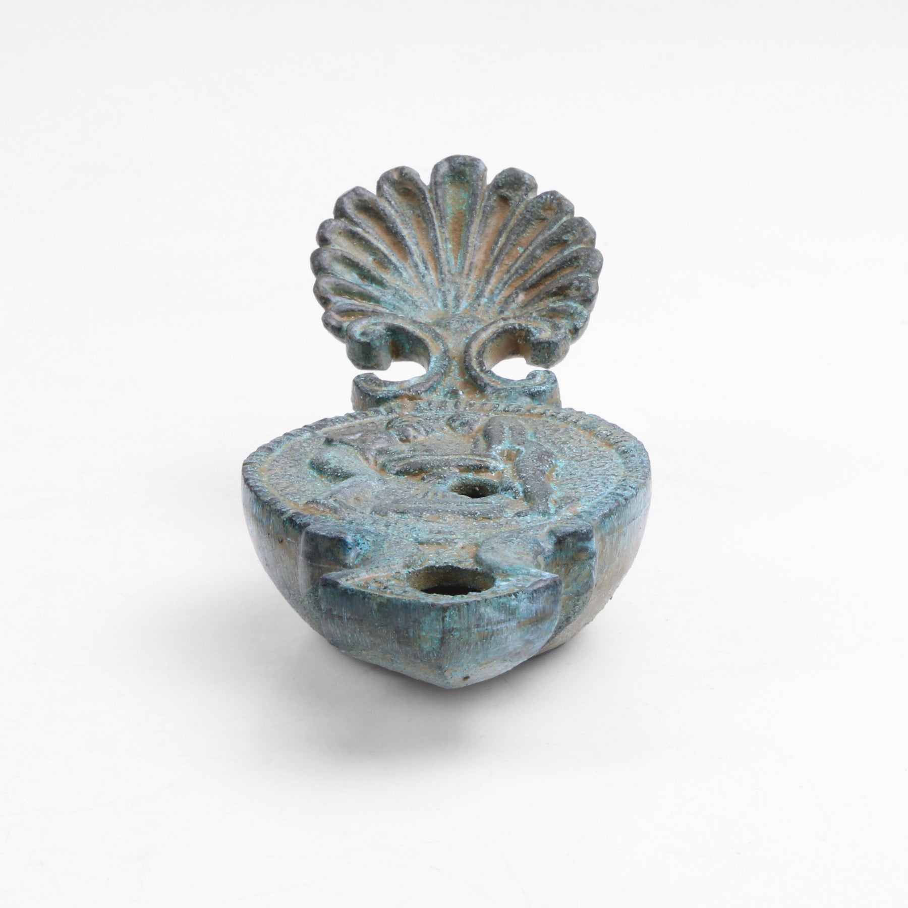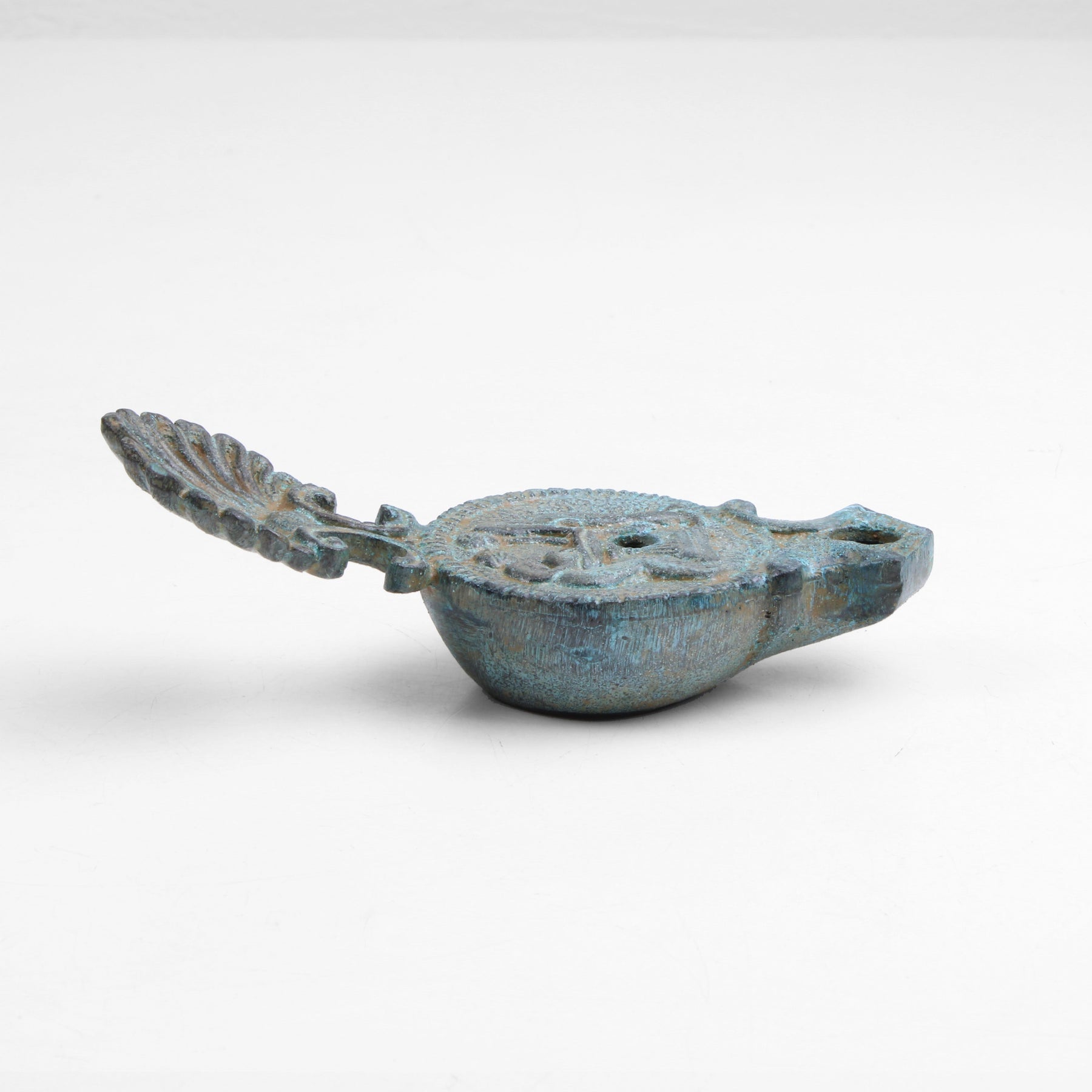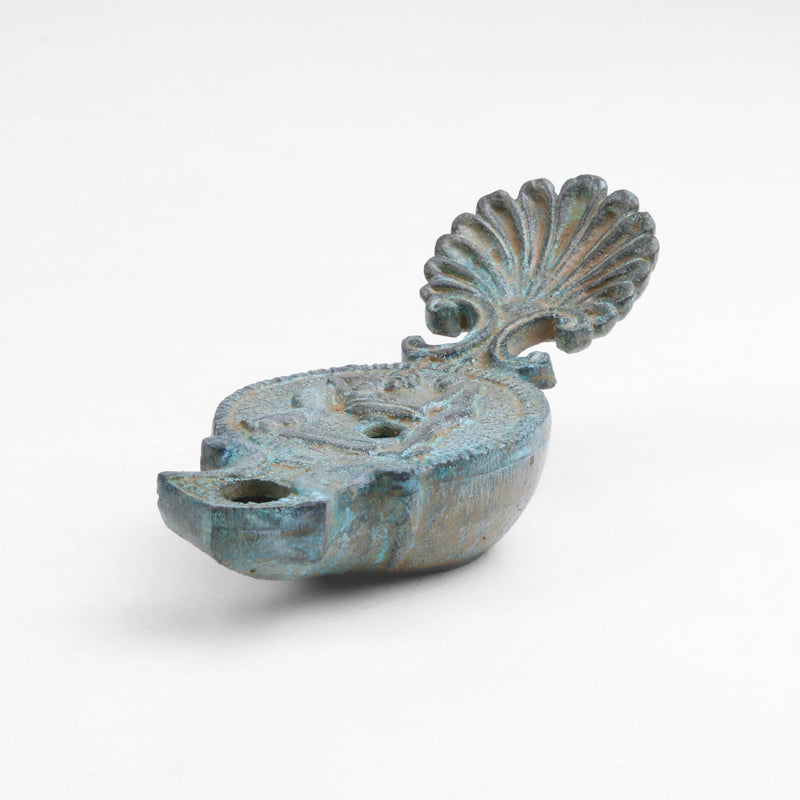 Lampe à huile en bronze avec un bec, décor de fontaine en relief et poignée en forme de coquille. Objet décoratif parfait pour bureau ou étagère.
